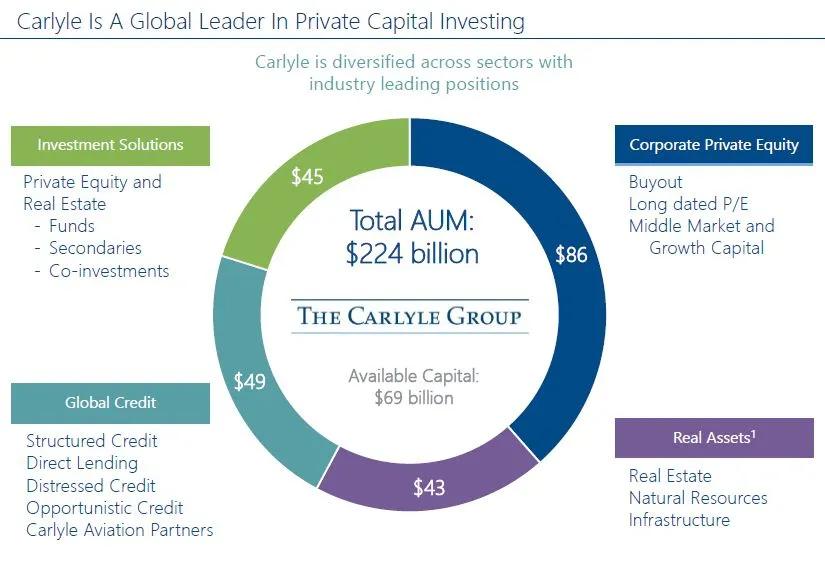 凯雷旗下有四大业务部门:企业私募股权(并购、中间市场和增长资本),实物资产(房地产、基础设施以及能源和可再生资源),全球信贷(不良资产和特殊资产、直接借贷、能源信贷、贷款及结构性信贷和机会性信贷),投资解决方案(投资于广阔且复杂的另类投资策略领域-- 私募股权及房地产)。