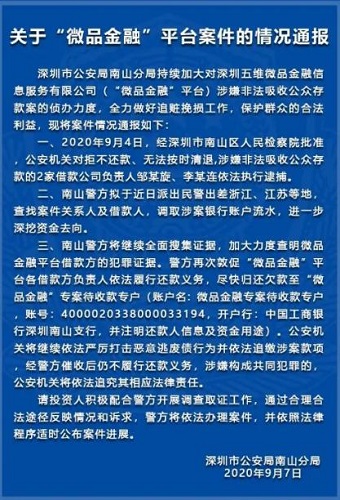2020-09-15 10:19:20 来源:光迅网 作者: 摘要:9月4日,经深圳市南山区人民检察院批准,公安机关对拒不还款、涉嫌非法吸收公众存款的2家借款公司负责人邹某旋、李某连依法执行逮捕。这是深圳公安局南山分局在对外通报某平台案件最新进展时公布的。