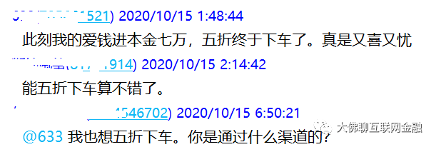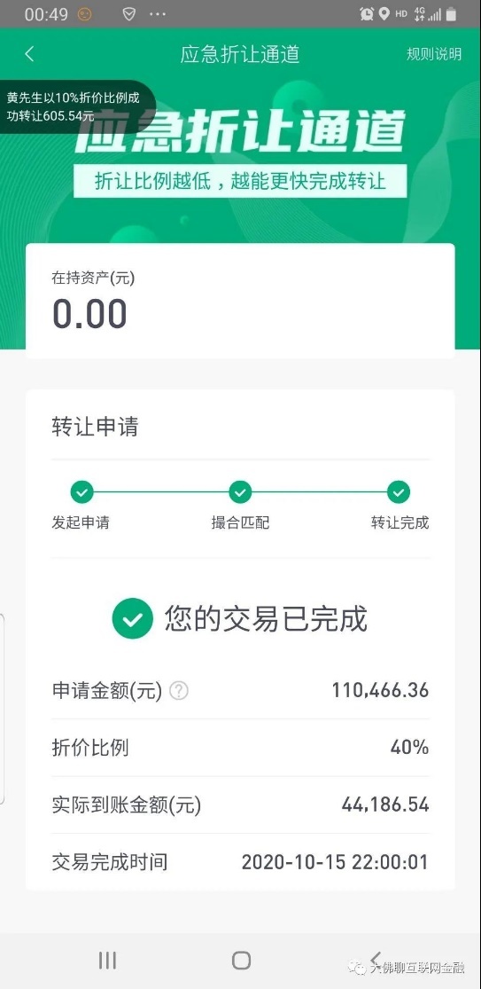 留给在营平台和出借人的时间已然不多。知名行业自媒体“大佛聊互联网金融”近日撰文表示,他观察到某些大平台的出借人成功打折跳车,折价比例有四折五折。比如11万的金额,折扣力度是40%,到账44186。他认为能四折走掉的都还算是可以的,比绝大多数立案的平台强的多,早点回来的钱,即使拿去存银行它也能产生新的利息,更别说投其他。