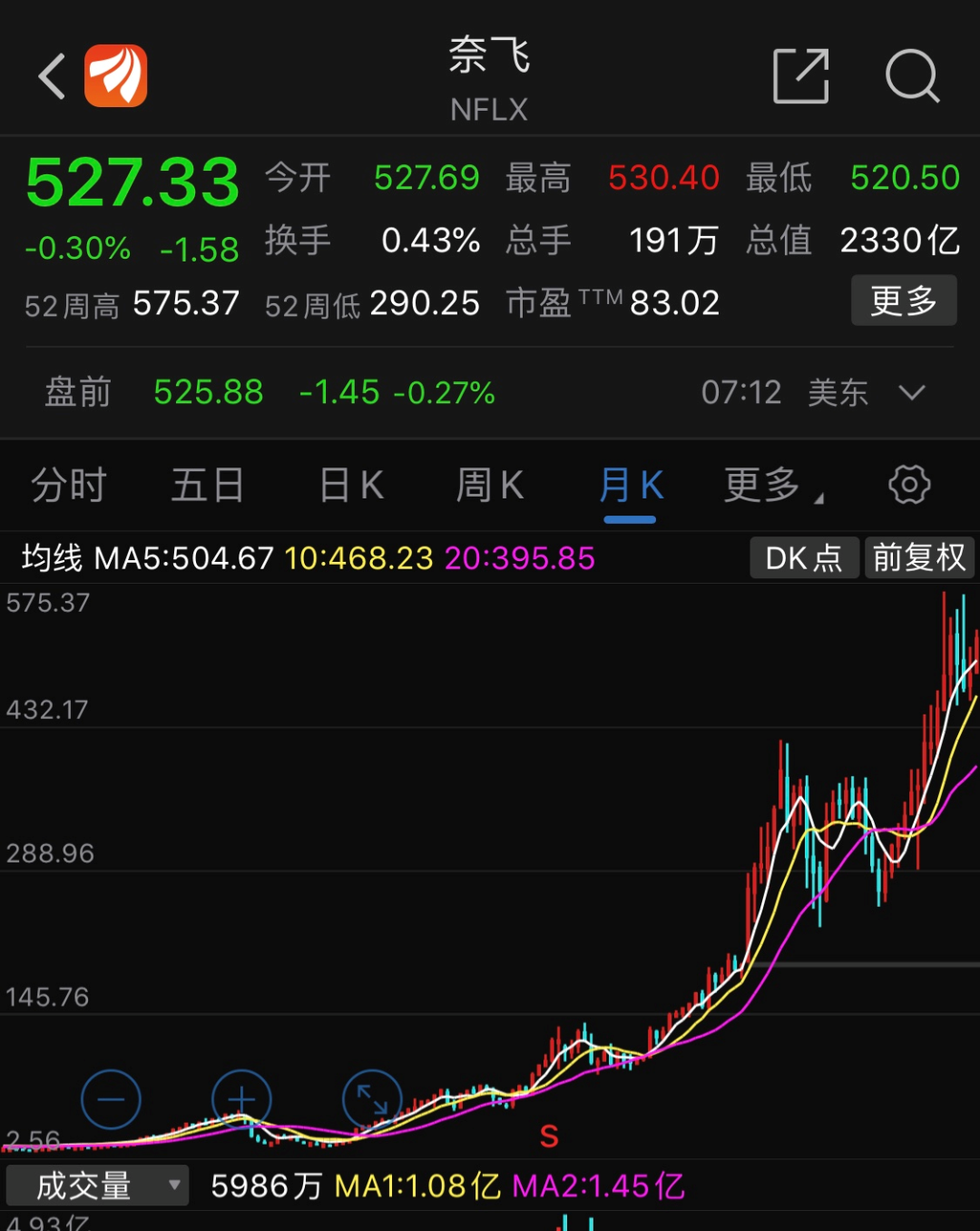凭借层出不穷的优质内容,奈飞付费用户数连年高增长,股价也进入一轮波澜壮阔的大牛市: