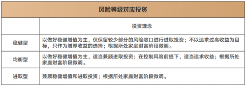 这两笔钱是在做好前两笔钱规划的基础上,用于投资增值的钱,不同的家庭需要根据自身的财富阶段及风险偏好进行合理分配。恒天家办根据风险承受能力将客户分成三类:进取型、平衡型、稳健型,并匹配相应风险承受能力给出了不同的配置方案。