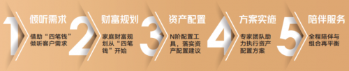 简言之,「银杏财富解决方案」是一站式、一揽子的财富解决方案,通过“4笔钱”“5步法”“9宫格配置工具”服务体系,为客户提供多元化、定制化的服务。