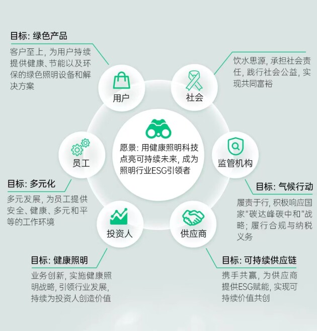 在亚运会开幕前几天,雷士照明正式发布了ESG报告,并宣布正式构建全面、立体的ESG治理体系——在该体系下,雷士照明提出了自己的ESG愿景,并设定了6大ESG目标、5大ESG承诺和15个ESG议题。