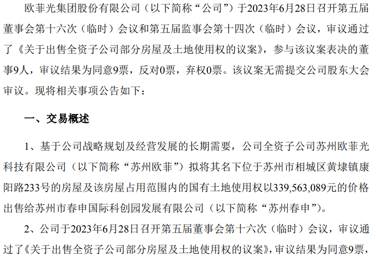 因为2023年6月29日的时候,欧菲光也曾发布过一份土地出售公告,基于公司战略规划及经营发展的长期需要,公司全资子公司苏州欧菲拟将其名下位于苏州市相城区黄埭镇康阳路233号的房屋及相关土地使用权以3.39亿元的价格卖给苏州春申,出售资产的目的还是,优化资产结构,增加流动资金。
