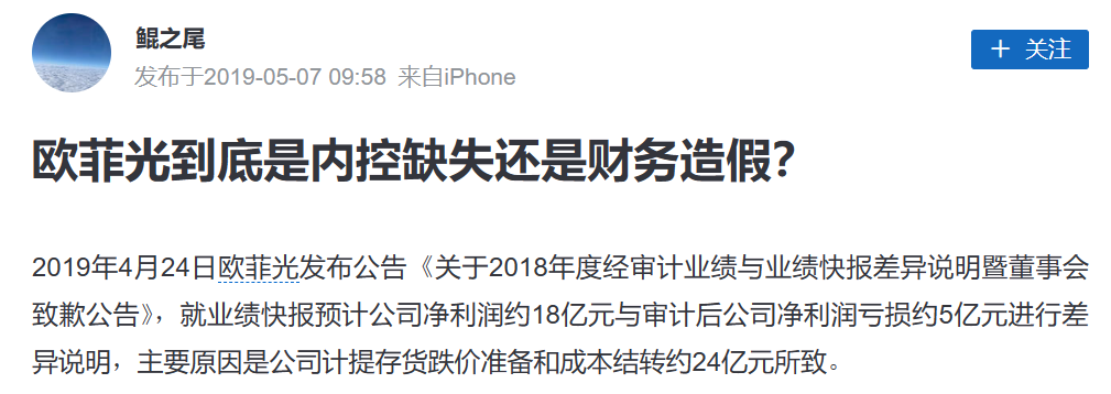 首先是2018年年报之前的问题,2018年6月1日欧菲光发布了一份会计差错更正公告,在2017年报中将上海融创支付给公司的2.2亿业绩补偿款计入“营业外收入”,导致当年财报利润多计1.79亿。