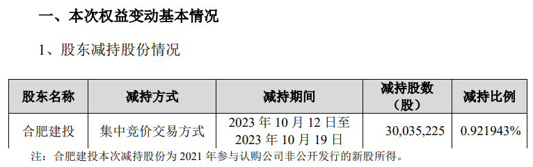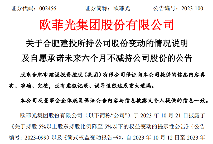 有意思的是,欧菲光在发布这份减持公告的同时,2023年10月21日也发布了一份股东合肥建投承诺未来6个月不减持的公告。