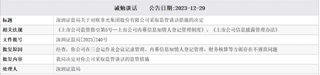 结果,到了2023年12月29日,欧菲光就因三会运作及会议记录管理、内幕消息知情人登记管理、财务核算等方面存在不规范问题被深圳证监局采取监管谈话。