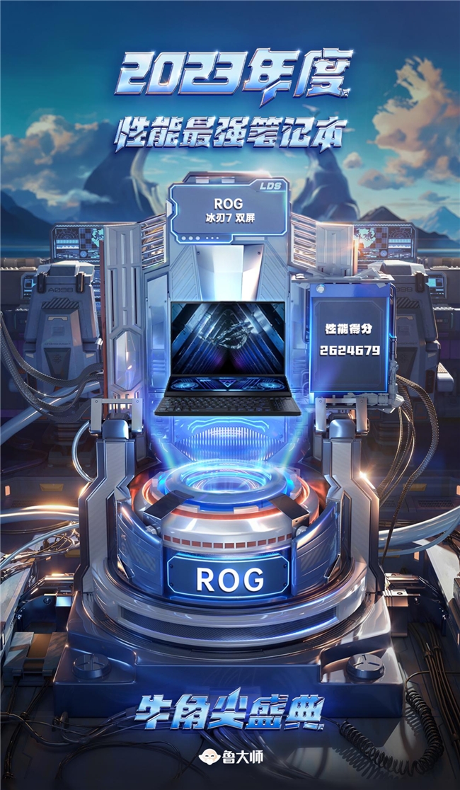 接下来是“年度性能最强笔记本”的颁奖,被搭载了年度性能最强移动处理AMD Ryzen 9 7945HX3D和NVIDIA GeForce RTX 4090 Laptop这样顶尖能配置的ROG 冰刃7 双屏拿下,同时其为这些顶级配件提供释放出强大性能保障的优秀设计与扎实用料也不容忽视。