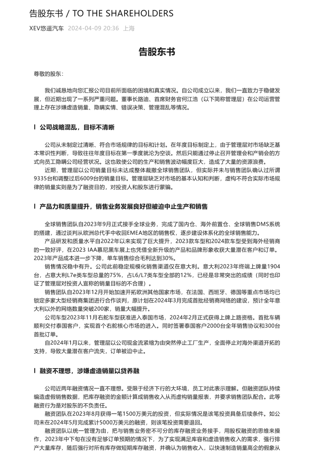 然而,奇怪的是,另一公众号“XEV 悠遥汽车”至今仍保留着“内幕原文”。先不管“内幕是真是假”,通过悠遥汽车种种操作来看,公司或已陷入重大危机之中。