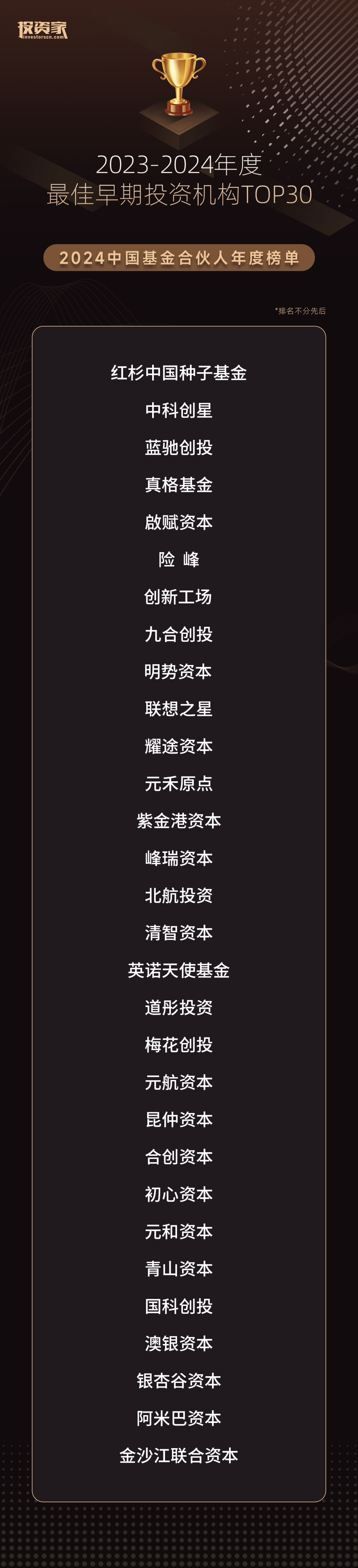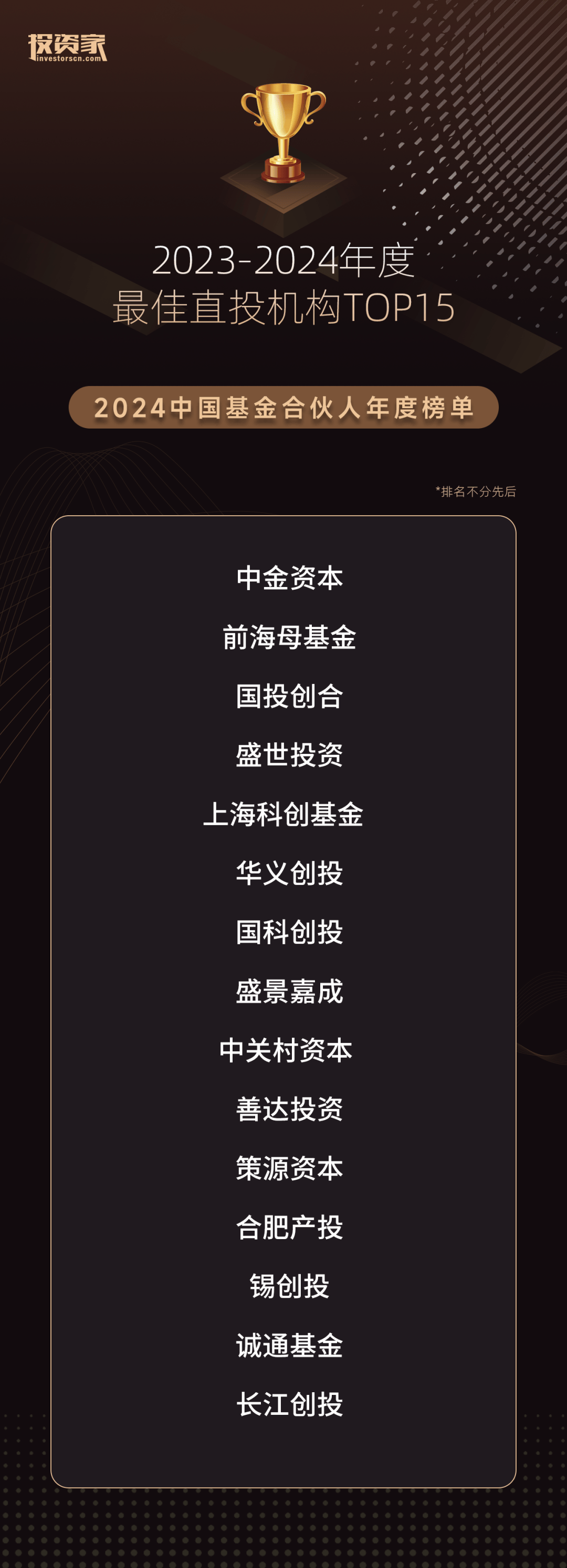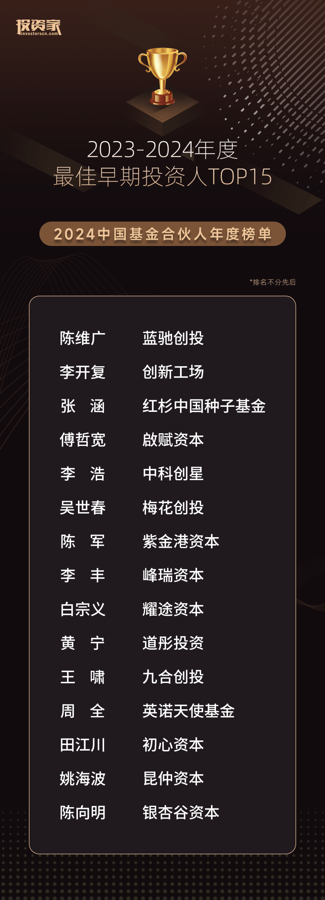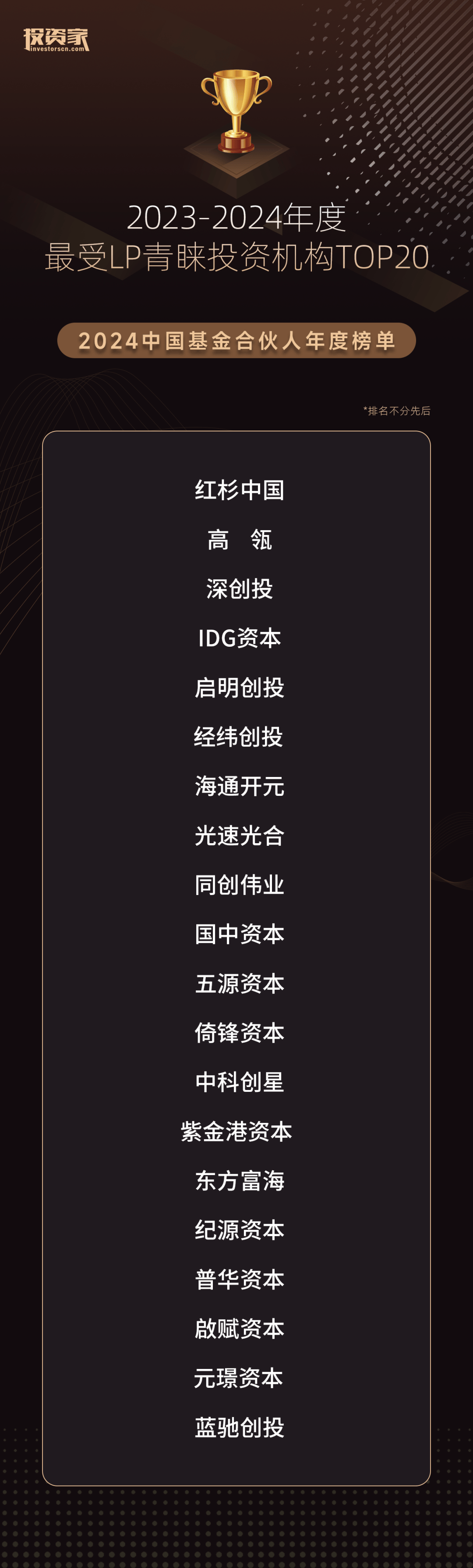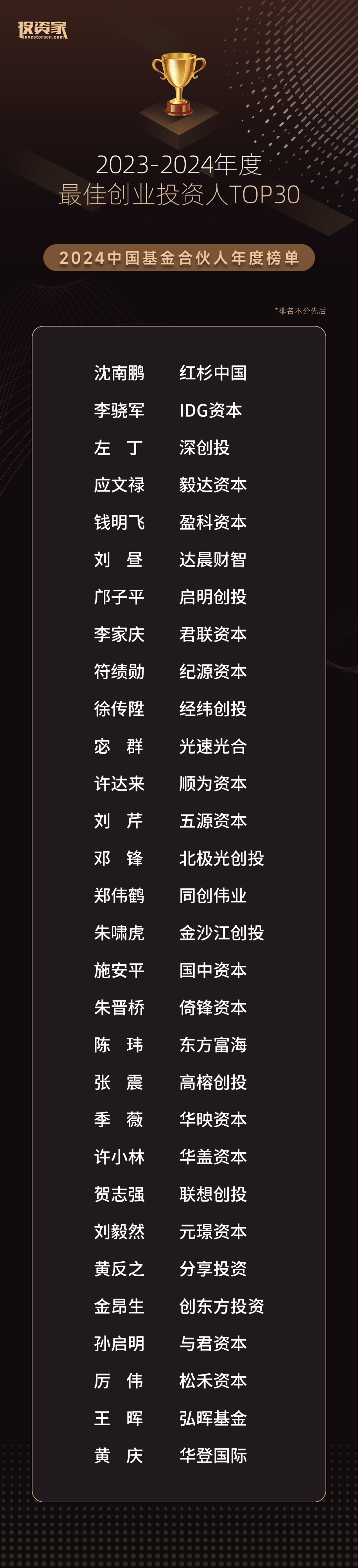 为表彰那些在新兴领域取得优异成绩的VC/PE、产业资本、母基金,投资家网延续以往,通过问卷调研、数据核查等流程,发布“投资家网·2024基金合伙人年度榜单”,持续挖掘闪耀创投圈的机构与个人。
