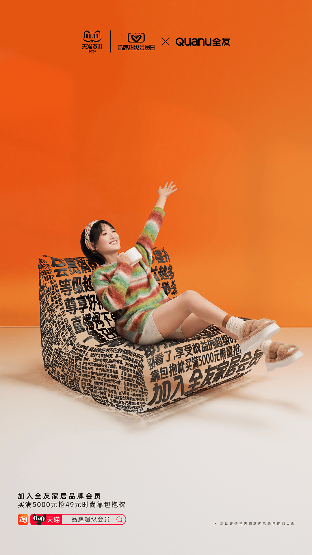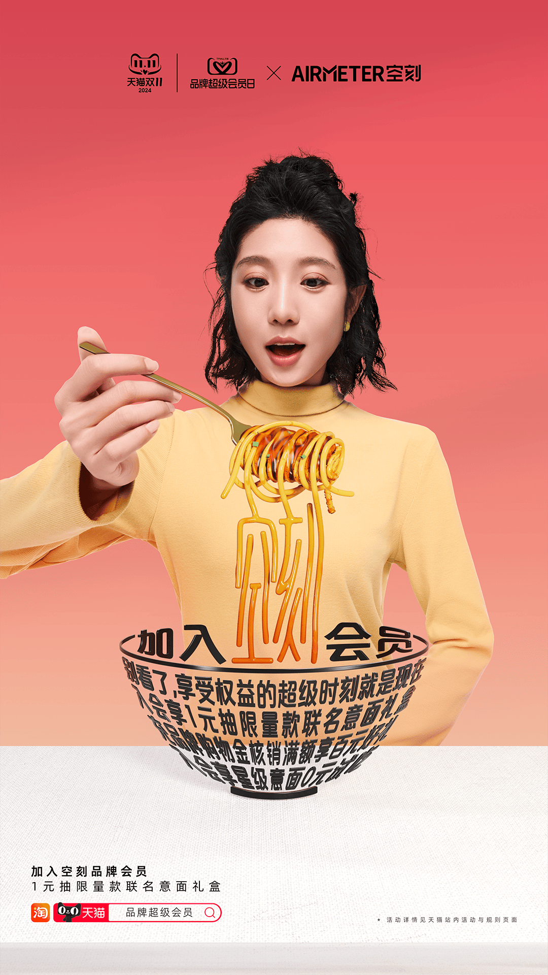 而后在双11期间,延续“别看了,先入会”创意形式,这次以“人物”为核心元素,以贴合品牌特性的方式,呈现日常人与物(产品、食品)的交互动作,又将文字信息融入到整体构图。