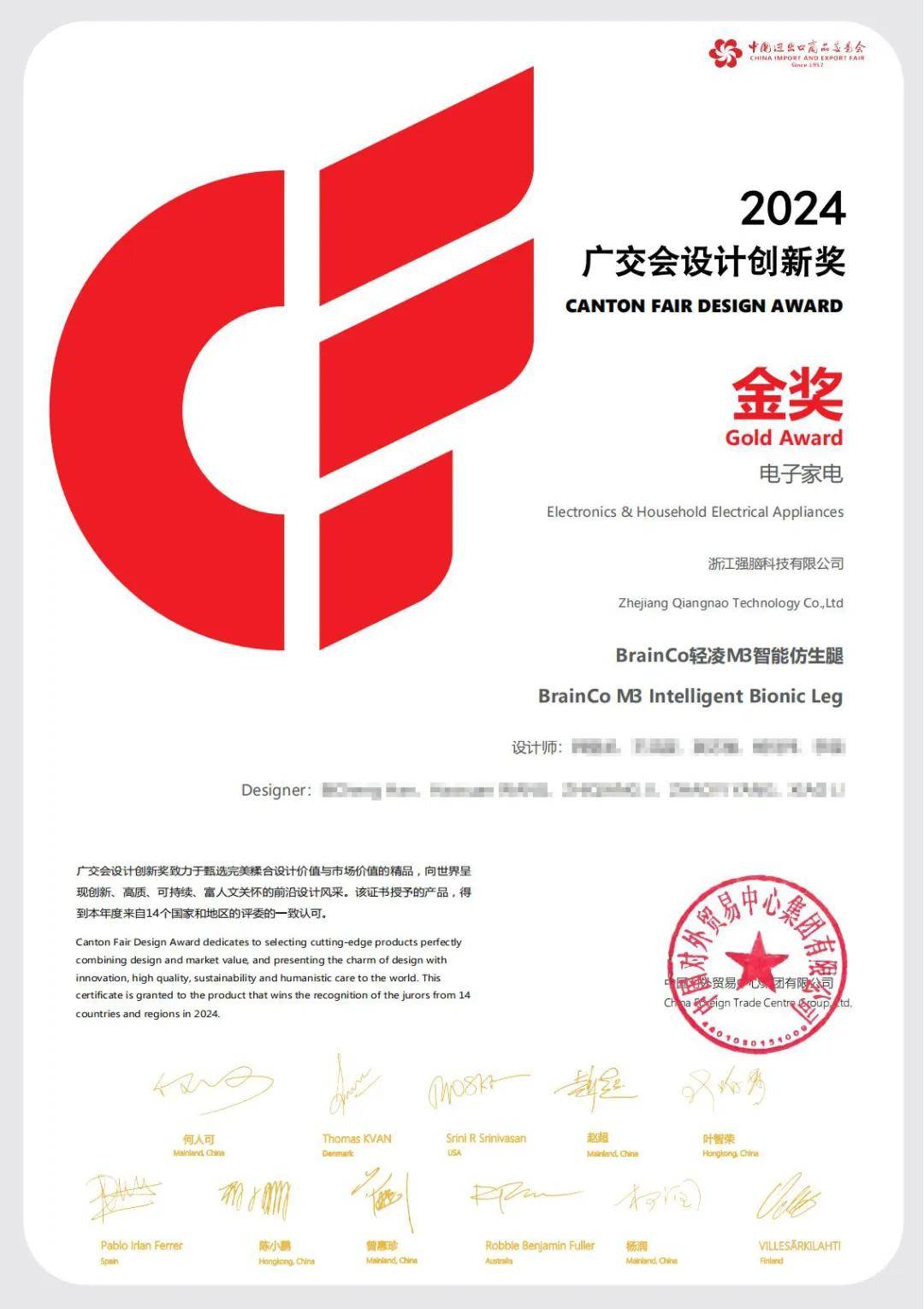 BrainCo智能仿生手斩获2024年广交会设计创新奖(CF奖)至尊金奖
