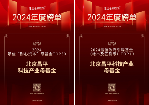 近日,母基金研究中心发布2024年度榜单,昌平科技产业母基金荣获“2024最佳‘耐心资本’母基金TOP30”和“2024最佳政府引导基金(地市及区县级)TOP13”两项荣誉。