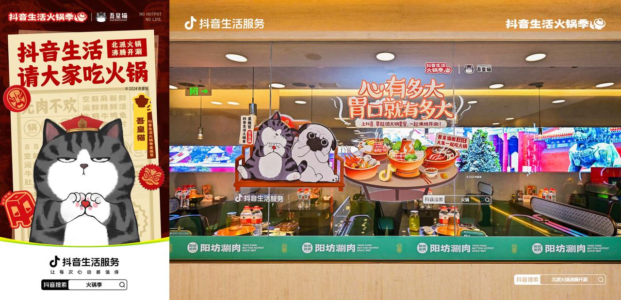 活动期间,抖音生活火锅季「北派火锅」与国民IP吾皇猫联手“搞事情”,以“心有多大,胃口就有多大”开启了跨次元萌趣联动。北京阳坊涮肉、济南徐升记、沈阳大吉利、南京王和李海鲜火锅大排档4位S级商家,通过与吾皇猫店内互动,吸引年轻用户充分整合线上线下资源,打造出一场趣味十足的火锅新风潮。