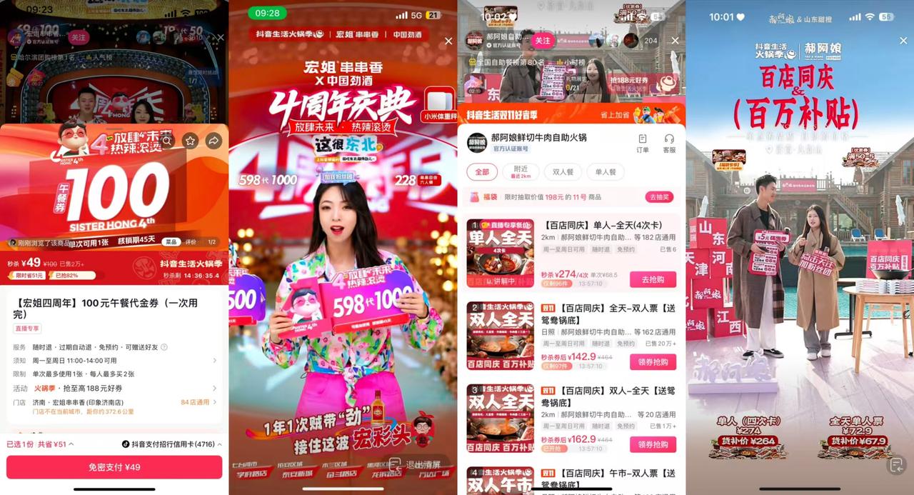 活动热度之下,众多商家纷纷开播,其中,郝阿娘火锅季开门红官号连播3天,并叠加达播1天,累计直播GMV高达1100万+,成功冲刺火锅节新增量;宏姐串串香4周年宠粉直播更是火力全开,开播3小时即达500万+,场观人数近3000,支付订单超过3万单。