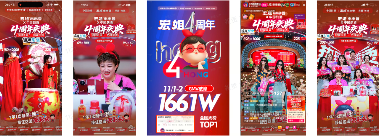 围绕4周年节庆,宏姐串串香推出价梯式套餐以及大额代金券,发挥老板IP 60万粉丝强影响力,以老板抖音号地毯式高频直播预告、150+达人冷启预热、私域预热,为直播间蓄水引流;直播期间,商家打造露营风实景,配合航拍多机位、夜间烟花表演,吸引众多目标客群关注,老板多次驾到送福利促成交易峰值,实现火锅季活动期间交易达2200万+,单日直播峰值达1200万+。