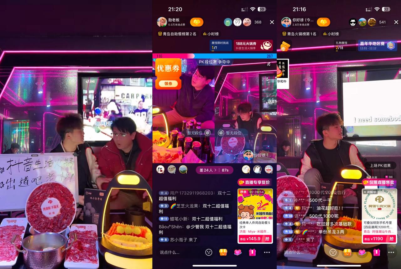 作为主打青岛本地高端自助餐的商家,阿强牛肉火锅同样充分依托2个老板的IP属性,以“老板专属福利”为噱头推出专属货盘,并应用高效的直播策略,在直播前,依托2个老板IP账号实现预热蓄水;直播中玩转霸王餐、老板直播PK等新形式,提升直播间趣味性,并基于跨店合作实现粉丝借力,有效提高了场观与转化,活动期间产出支付GMV达200万+,为火锅商家直播提供了全新的玩法与模式借鉴。