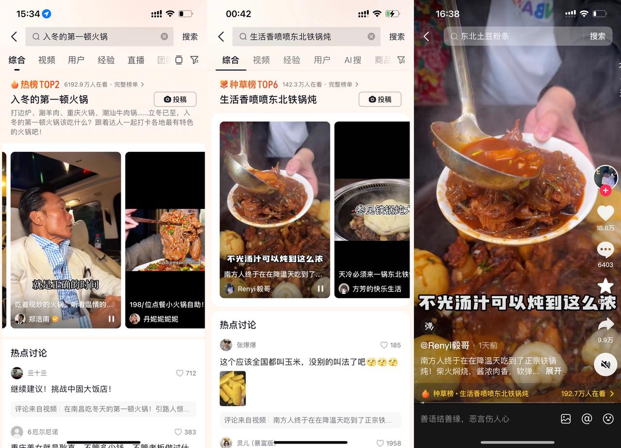 丰富的内容矩阵有效带动了话题热度攀升,#入冬的第一顿火锅 曝光量超2.8亿,登全国榜top2,#生活香喷喷东北铁锅炖 曝光量达2100万+,登种草榜top6。借助知名艺人的明星效应和boss的露出,活动充分调动起年轻人兴趣,激发了在站内外的自发传播,也提升了火锅商家知名度,为后续商家的转化带来更多可能。