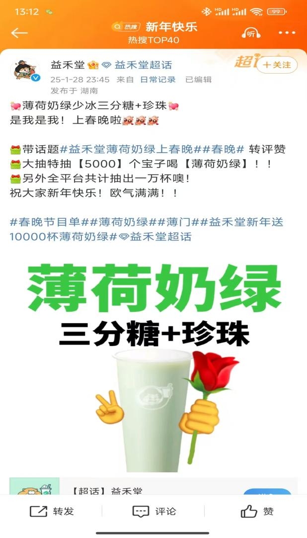 在薄荷奶绿成为全民热议焦点的同时,益禾堂的官方账号也迅速认领了这一热门话题。为了回馈广大消费者的热情支持,益禾堂立即推出#益禾堂新年送10000杯薄荷奶绿#的活动,覆盖微博、小红书、抖音三大平台。这一活动不仅让益禾堂的品牌形象更加深入人心,更激发了网友们参与互动的热情。随着话题的不断发酵,微博、小红书等社交平台上的互动如潮水般涌来,网友们纷纷晒出自己手中的薄荷奶绿,分享着与这款饮品的独特情缘。一时间,薄荷奶绿成为国民心中的“清新代表”,其独特的口感和清新的气息让无数人为之倾倒。据益禾堂透露,大年初一薄荷奶绿销量环比去年增长超110%,全国薄荷奶绿单品总杯量超20万+。