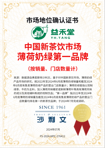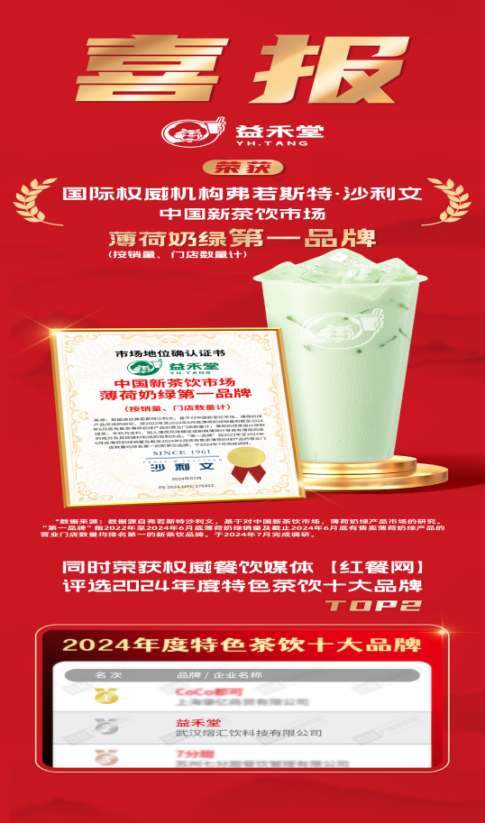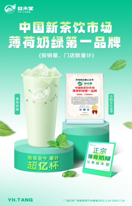 早在去年,益禾堂的薄荷奶绿就已成为继益禾堂烤奶后的新爆款,上市至今累计销售破亿杯,连续5个月销量top1,北方市场单品销售占比近40%。其卓越的品质和口感赢得了市场的广泛认可,并荣获了沙利文认证机构授予的“中国茶饮市场薄荷奶绿第一品牌”称号。沙利文作为全球知名的认证机构,其认证标准严格而权威,这一荣誉无疑是对益禾堂薄荷奶绿品质和口感的最好证明。