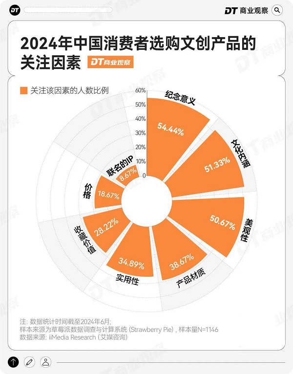 根据数据智能科技平台MobTech发布的《2024年文创行业报告》,超过64%的消费者购买文创产品时主要由兴趣驱动,他们更看重的是文创产品的“情绪和文化等附加价值”“设计感”和“纪念意义”,而非单纯的功能性。