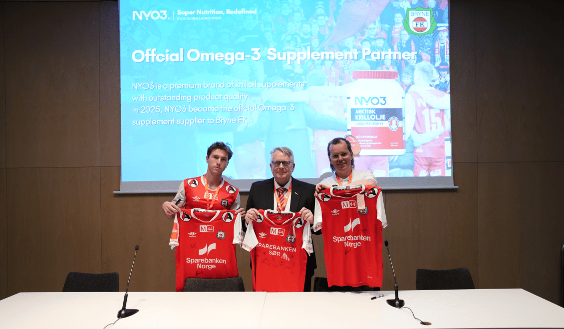 除抗衰领域外,NYO3积极拓展磷虾油应用场景,进军专业运动营养市场。旗下产品阿蒙森磷虾油通过了“不含WADA兴奋剂成分”检测,其作为专业运动营养的安全性得以证实。发布会上,球星哈兰德母队布吕讷球队(Bryne FK)的教练与球员亲临助阵,分享产品在提升运动耐力与恢复效率中的核心作用,并与NYO3签订合作协议:NYO3将作为球队唯一指定运动品类Omega-3营养补充剂。未来,NYO3将加码运动营养赛道,研发专业运动系列新品,实现从高端膳食到运动健康等多消费场景覆盖。