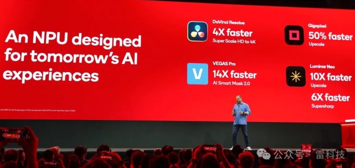 在 Adobe、DaVinci Resolve 等软件测试中,骁龙平台 NPU 的 AI 处理速度比英特尔酷睿 Ultra 7 GPU 快了数倍,同时还保持了低功耗、长续航的优势。