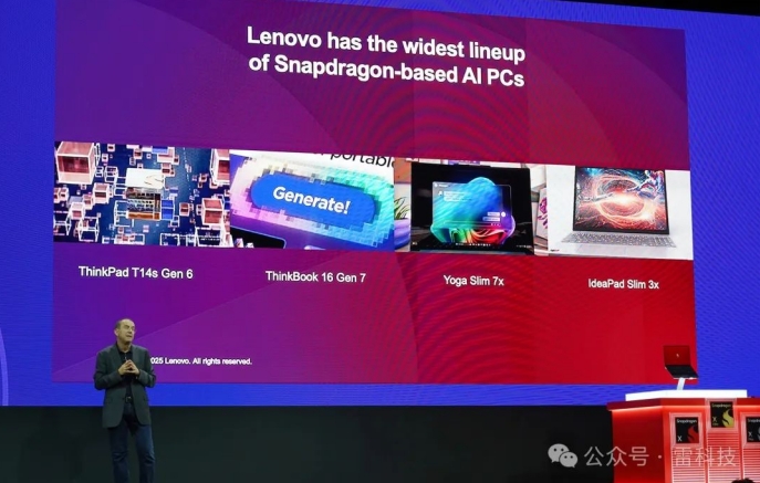 除此之外,联想执行副总裁、IDG 智能设备业务集团总裁 Luca Rossi 还宣布了面向商务人士和 IT 领导者,推出搭载骁龙 X Elite 的第六代 ThinkPad T14s 和第七代 ThinkBook 16,专为原生 AI 工作场所打造。而面向创作者和创新者,联想也推出了同样搭载骁龙 X Elite 的 Yoga Slim 7x。