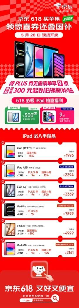 除了iPhone 16系列手机外,京东PLUS会员购热门iPad和Mac产品无需凑单直接打9折,还可叠加618限时优惠和国家补贴。其中,128G WLAN版iPad Air 11英寸M3限时优惠叠加国家补贴立减500元优惠,PLUS会员到手价低至3369元;128G WLAN版iPad 11英寸限时优惠叠加国补立减,PLUS会员到手价2294元;13.6英寸16+256G版MacBook Air M4,限时直降2000元,叠加国补PLUS会员到手价到手价5299元,支持12期免息;16+256G版Mac mini M4台式电脑主机,京东PLUS会员际500元补贴,叠加国补优惠,到手价3239元。