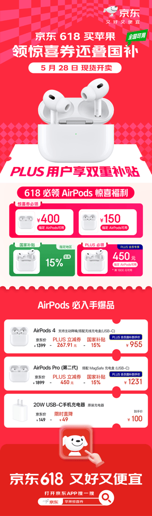 来了!“又好又便宜”的京东618将于5月30日晚8点正式开启。更加惊喜的是,这一重磅补贴政策将提前引爆,在5月28日晚8点开启的“京东超级补贴日”就将上线,率先放价。其中,Apple产品京东自营旗舰店每晚8点限时领1200元以旧换新券,还可享受国家补贴立减500元、苹果惊喜券等优惠。值得一提的是,购买指定iPhone还可领取陕西消费券,全国消费者可领可用,至高减400元,iPad Pro、Mac以及6000元以上iPhone可用。此外,iPad、Mac、Apple Watch、AirPods等热门产品均有惊喜超值价,打开京东搜索“苹果惊喜券”,一键直达活动页面。