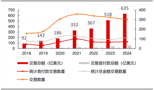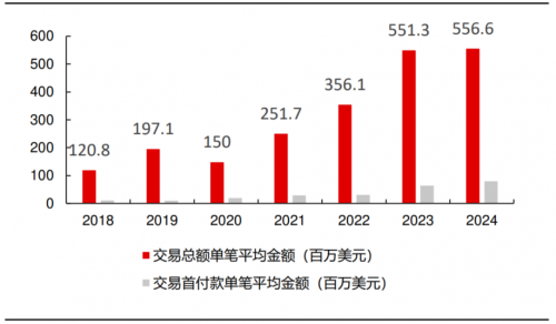 在重磅交易方面,中国的成交金额从 2021 年的 100 亿美元跃升至 2023 年的 350 亿美元、2024 年达到 430 亿美元,占全球总额的 18.3%,首次逼近 20%关口,越来越多的高额合作项目持续落地。