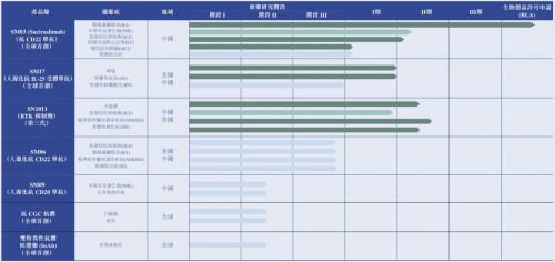 例如公司的旗舰产品舒西利单抗 (Suciraslimab,SM03) 是治疗类风湿关节炎(Rheumatic Arthritis,RA)以及其他免疫性及神经免疫性疾病(如系统性红斑狼疮、干燥综合症、阿尔茨海默氏症导致的轻度认知障碍、以及阿尔茨海默氏症)的潜在全球首创抗CD22单抗药物。