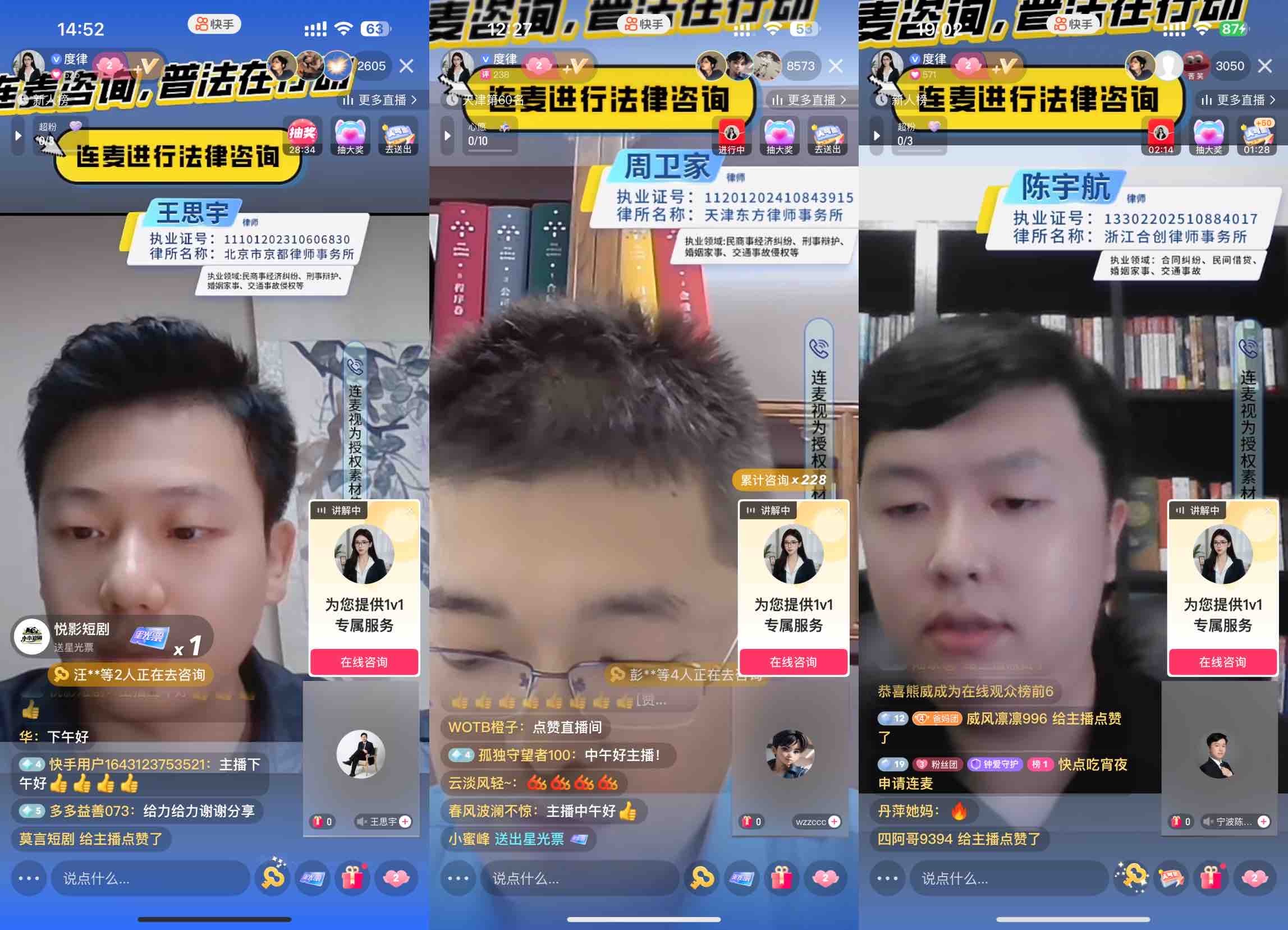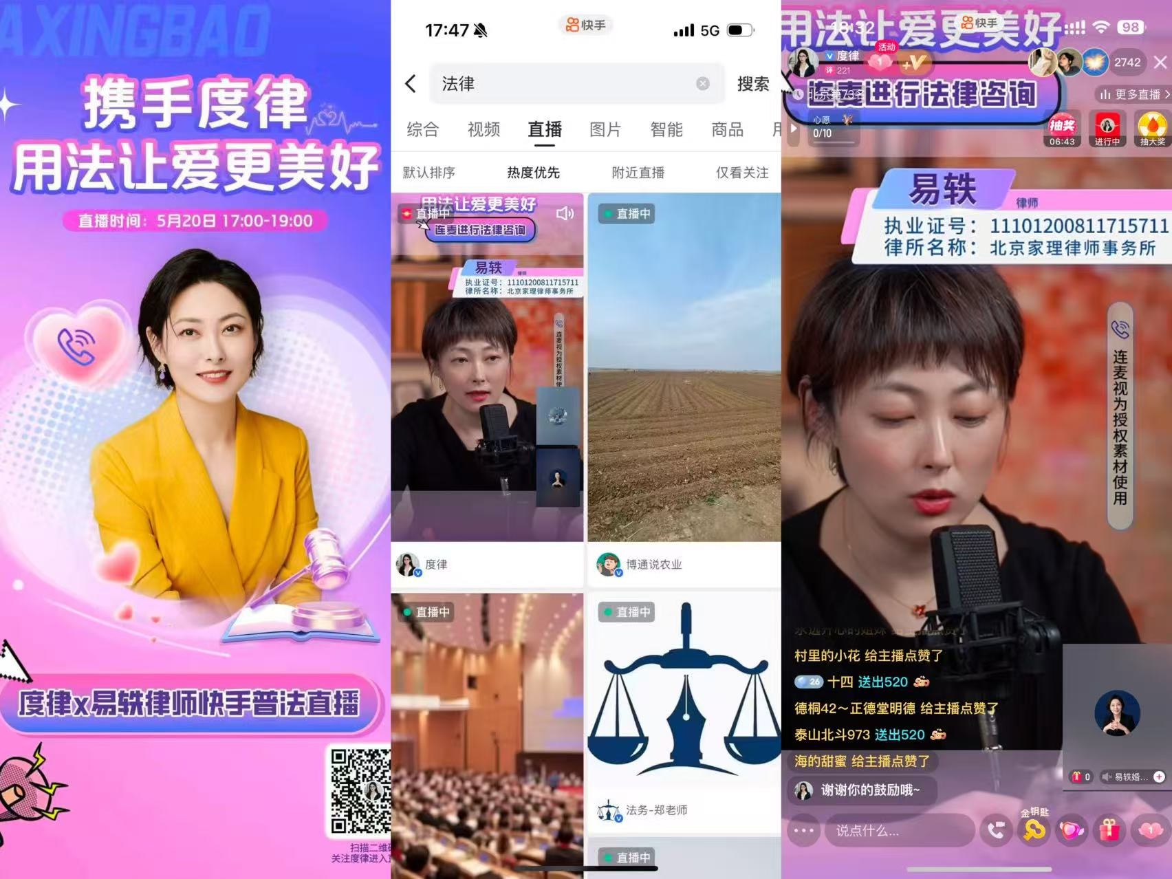 与此同时,在矩阵运营的「度律」快手账号上,一场联动真人律师的直播也同步火热开启。度律x易轶律师与用户实时连麦,倾听他们在生活中遇到的法律难题,并给予专业、耐心的解答。