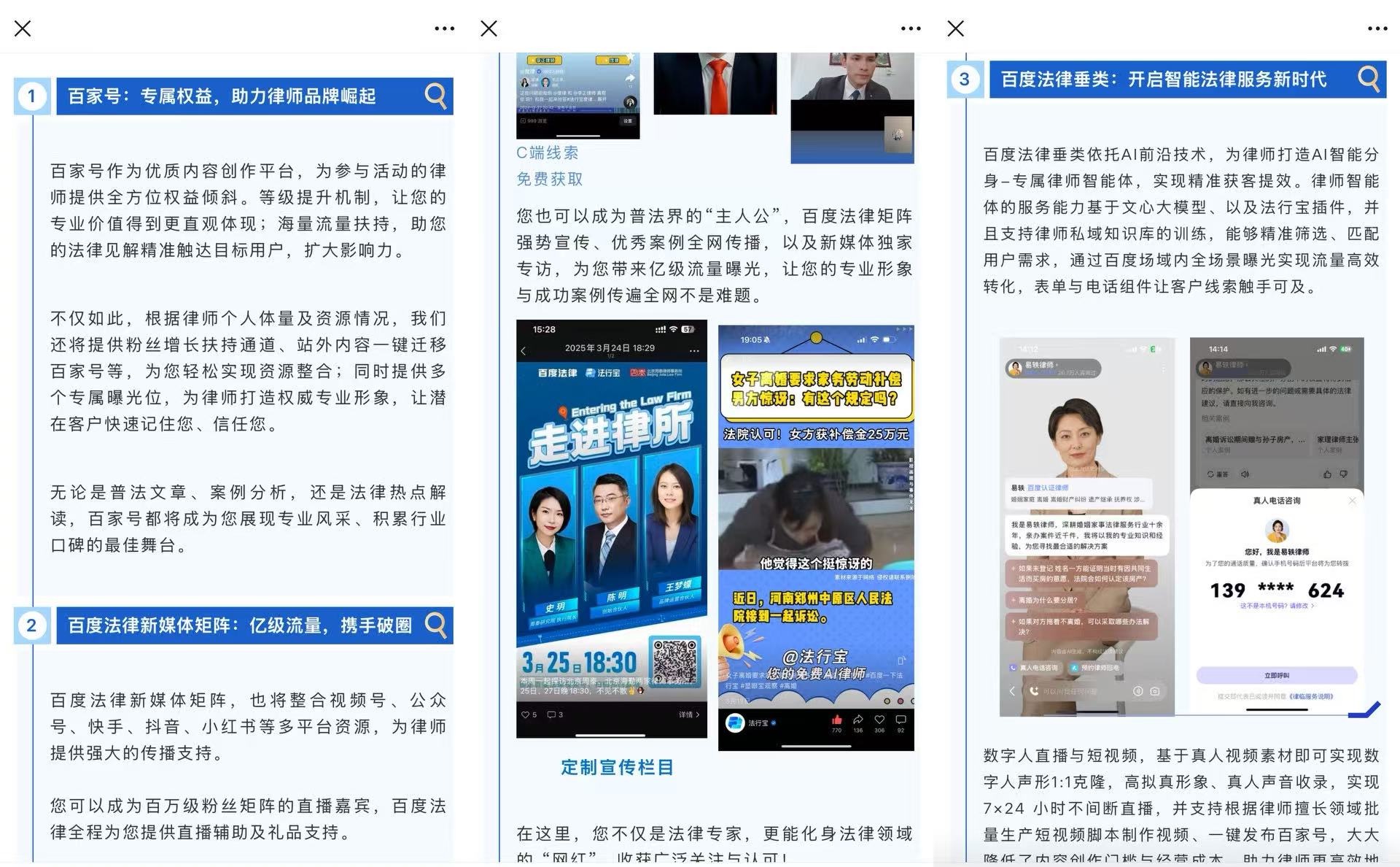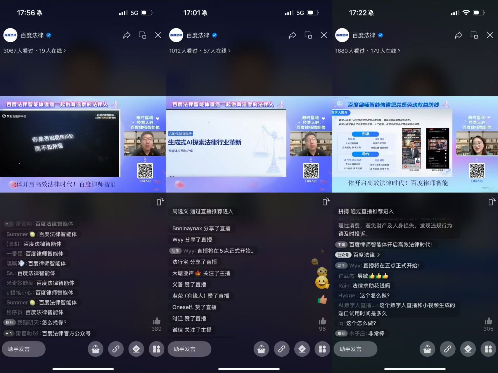 5月20日当天,百度法律智能体官方开展了两场直播活动。在百度法律智能体的官方视频号上,资深运营专家深入拆解律师智能体、数字人核心应用,为律师们带来了一场技术与法律融合的知识盛宴。这场直播不仅详细介绍了如何运用 AI 技术解锁案源拓展的新姿势,更深度分析了百度律师智能体如何为律师赋能,吸引了很多律师同仁在线观看。