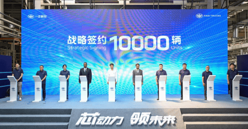 一汽解放总经理、党委副书记于长信与塔赫米德运输公司、上海安能等企业代表共同签订战略合作协议,进一步深化商业合作,共绘领航蓝图。