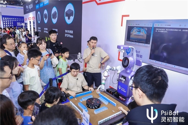 灵初智能麻将机器人与现场观众同桌博弈的场景吸引了众多参观者围观。机器人可与现场观众共同完成30分钟以上的连续麻将对局,以毫米级精度完成摸牌、放置、碰杠等复杂操作,在与人类玩家的实时博弈中展现策略思考,动态构建决策链,自主完成碰杠等博弈决策。观众不仅可以现场观看,更能亲自上桌与机器人对弈,体验机器人如何融合视觉、语言与动作信息,形成游戏博弈和具身操作的融合,展示真正意义上的"会思考的手"。