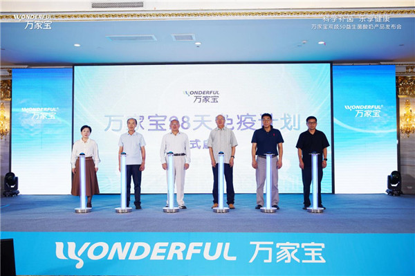 此次发布会,万家宝启动28天免疫计划品牌活动,以双歧50益生菌酸奶为产品,万家宝将征集100位消费者进行产品体验,共同见证“益生菌”+“益生元”双重呵护肠道健康,提高免疫力的过程。张守文、霍贵成、石彦国、韩俊、张冰岩、徐慧群六位嘉宾领导共同为28天免疫计划启幕。