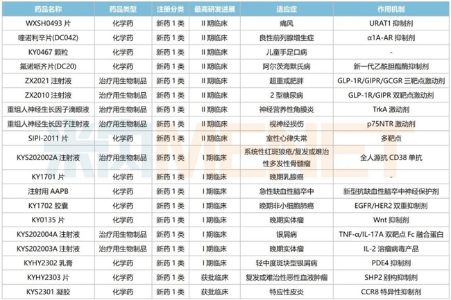 化药1类创新药方面,氟诺哌齐片(阿尔茨海默病)完成II期临床数据统计;Wnt抑制剂KY0135片、EGFR/HER2双重抑制剂KY1702胶囊启动I期临床,均为抗肿瘤药;CCR8特异性抑制剂KYS2301凝胶提交IND并获批临床,用于治疗特应性皮炎等。