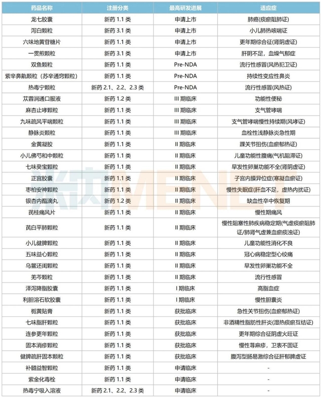 12款中药1类新药处于II期临床。其中,七味癸宝颗粒(卵巢功能不全)、正宫胶囊(子宫内膜异位症)、乌鳖还闺颗粒(卵巢功能不全)为妇科用药,芪白平肺颗粒(慢阻肺)、羌芩颗粒(流感)为呼吸系统药物,银杏内酯滴丸(缺血性卒中)、五味益心颗粒(冠心病稳定型心绞痛)为心脑血管疾病药物,小儿佛芍和中颗粒(腹痛)、小儿健脾颗粒(消化不良)为儿科用药等。