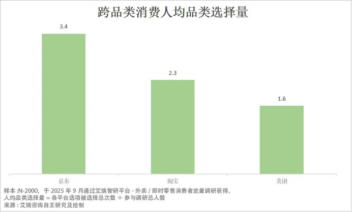 外卖业务不仅是独立的战场,更是为平台主营业务输送高频次、高价值用户的“超级入口”。而协同价值的真正深度,体现在不同平台在用户心智中已形成了泾渭分明的“品类领地”。调研显示,京东外卖用户跨品类消费人均选择3.4个品类,远超淘宝(2.4个)和美团(1.8个),外卖流量成功转化为高客单价消费,形成“外卖获客-全品类留存”高效闭环。