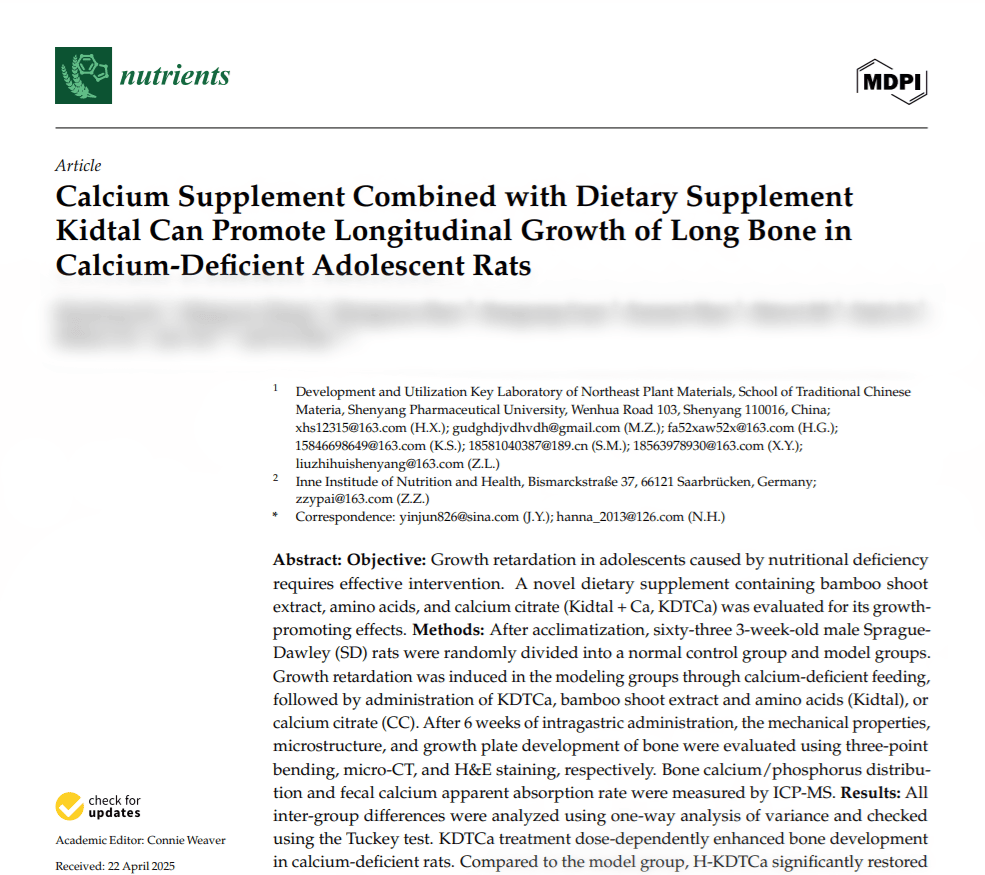 inne竹节钙专利成分Kidtal®的研究成果被《Nutrients》收录