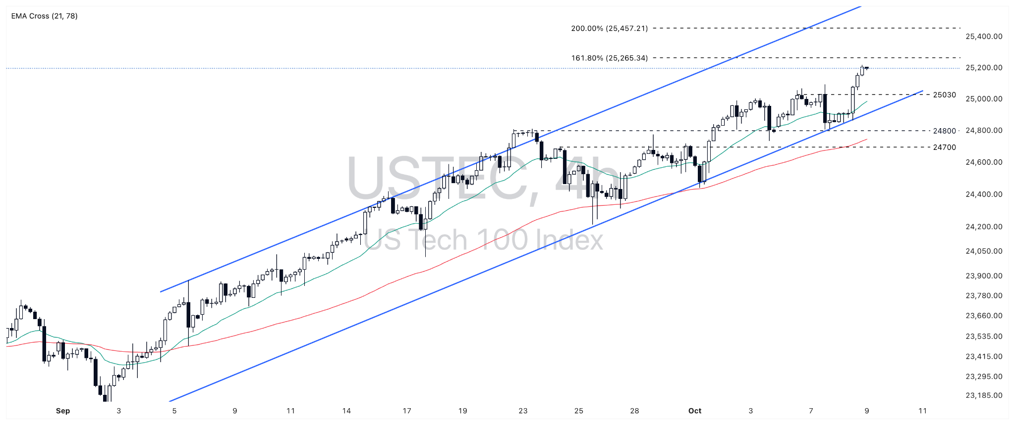 从技术面分析,在回测上升通道下沿后,USTEC反弹至历史新高。此轮上涨展现出强劲的多头动能。若维持在25030上方,指数或将再度试探25265的161.8%斐波扩展位。